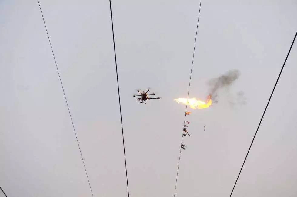 他們采用工業(yè)用無人機(jī),下面加裝了特制的噴火裝置。相對(duì)于人工除障,無人機(jī)噴火除障不但消除了高溫天氣下人工除障的不安全因素,而且不需要停電,大大提高了作業(yè)效率。